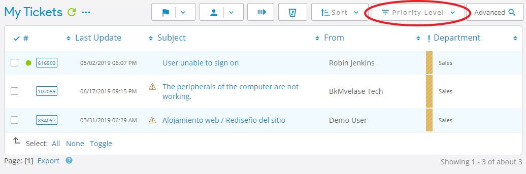 So I tried adding Priority Level as a Quick Filter in the My Tickets queue. Bingo! It shows up as a button with a drop down menu.