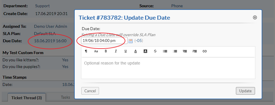 Now, we open the edit-ticket dialog and change anything: for instance, change the subject of the ticket. Now, wenn you click on “save” and hold execution with debug mode, you can see in both, the UI and POST-variables, that the duedate switches to <current duedate> -1 day at 10 pm: